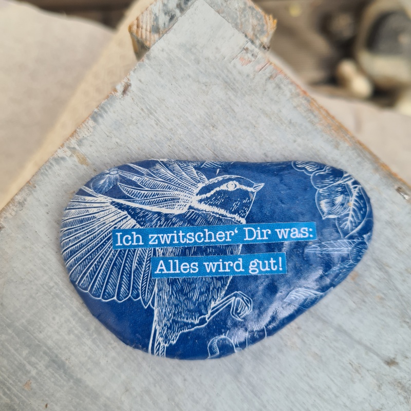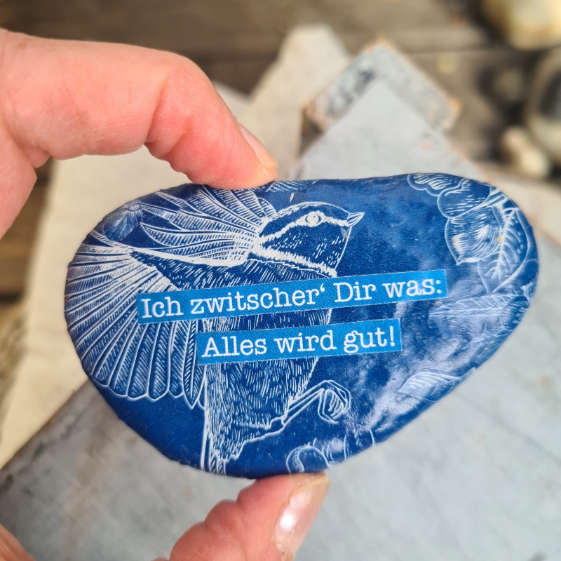 Ich zwitscher‘ Dir was: Alles wird gut. Das trällert der Vogel auf dem Stein Dir zu und sorgt für Zuversicht. Ein hübscher, blauer Geschenk-Stein zur Aufmunterung und für ein Lächeln im Gesicht.