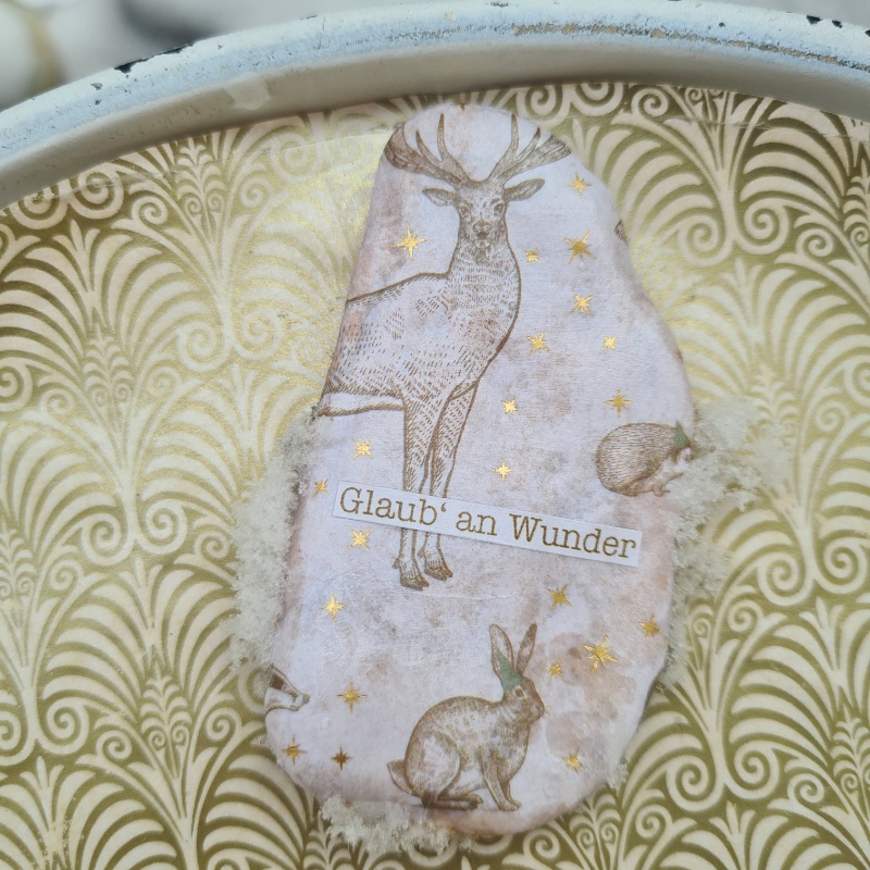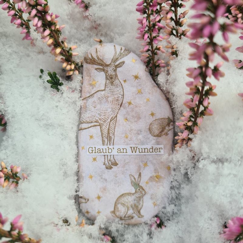 Glaub an Wunder. Eine gut gemeinte, wichtige Aufforderung auf einem zauberhaften, länglichen Stein mit magischer Waldtiere-Schar. Denn es gibt – um es mit Albert Einsteins Worten zu sagen – nur zwei Arten zu leben: so als wäre alles ein Wunder oder so als wäre nichts ein Wunder…