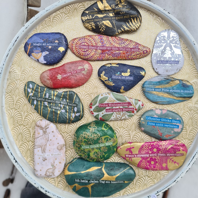 Die Steine sind alle handgefertigt und von Natur aus Einzelstücke. Deswegen kann es zu leichten Abweichungen von der Abbildung kommen. Sie sind mit einem Schutzlack überzogen und deswegen sehr robust, aber nicht hundertprozentig wetterfest. Für Balkon und Garten eigenen sie sich deswegen nur bedingt.