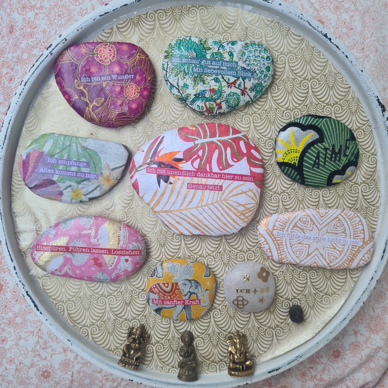 Ich empfange. Alles kommt zu mir. Eine kraftvolle Affirmation auf einem Dschungelmuster-Stein, der im Nachklang meines Sri Lanka-Aufenthalts entstanden ist. Dort konnte ich spüren und erleben, wie es ist, im Empfangsmodus zu sein und sich dem Leben vertrauensvoll hinzugeben. Ein Geschenk!