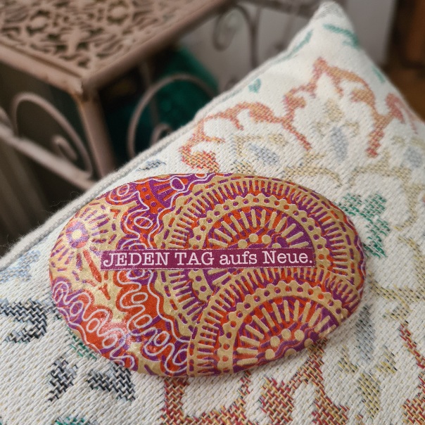 Jeden Tag aufs Neue. Neuer Tag, neue Chancen, neues Glück. Du kannst Dich jeden Tag neu entscheiden; jeden Tag aufs Neue dranbleiben, etwas ändern oder Dich überraschen lassen. Der flache Fluss-Stein ist Dir dabei ein guter Begleiter. Denn egal, was gestern war, heute ist alles neu – wenn Du das so willst.