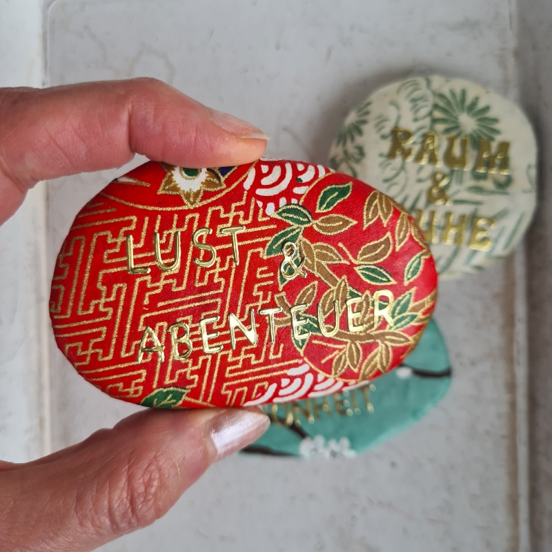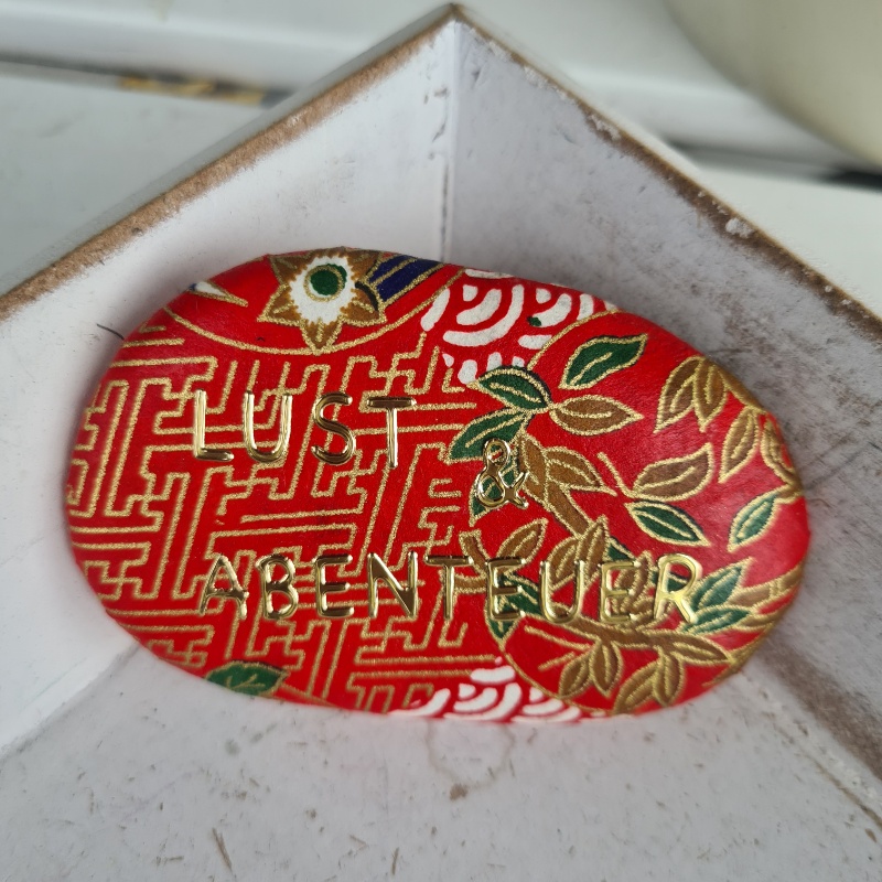 Lust & Abenteuer. Zwei absolute Power-Worte im Duett auf einem prächtigen, roten Fluss-Stein mit von Hand applizierten Gold-Lettern. Was bist Du bereit zu tun, um mehr Lust & Abenteuer in Deinem Leben zu kreiieren? Was immer Dir jetzt einfällt, fang‘ damit an! Dieser Stein wird Dein täglicher Anstupser sein, dran zu bleiben.