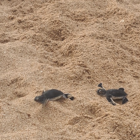 Ich verbringe einen Traumtag, lasse mich treiben, beobachte die tosenden Wellen, entdecke einen Eisvogel auf einem Stein am Wasser, staune über zig prächtige Einsiedlerkrebse und ihr geschäftiges Herumgekrebse, während ich in einem versteckten Strandlokal als einziger Gast ein extra für mich frisch gekochtes Curry genieße, sehe mehrmals eine Meeresschildkröte den Kopf aus dem Wasser recken und als ich am Abend eigentlich schon ins Hotel zurück will, weil es bald finster wird, bekomme ich den Impuls, mich genau hier in den Sand zu setzen und innezuhalten. Und dann sehe ich sie: zwei winzige, frisch geschlüpfte Schildkrötenbabies, die direkt neben mir im Sonnenuntergang Richtung Meer flitzen und ins türkise Wasser purzeln. Unfassbar schön.