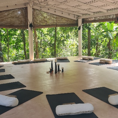 Unser Tagesablauf ist in etwa jeden Tag gleich und für mich einfach nur perfekt. Ich wache so um 7 Uhr auf, setze mich vor unser Zimmer auf die kleine Terrasse oder ans Pool und lausche dem betörenden Dschungelkonzert, beobachte knallbunte Vögel, putzige Palmenhörnchen oder von Palme zu Palme turnende Affen. Manchmal setze ich mich auch schon in die auf drei Seiten zum Dschungel offene Yoga-Plattform, um zu meditieren oder mich einfach im Grün und in den Geräuschen zu verlieren. Dann folgt um 8 Uhr eine sehr freie, spielerische „Somatic Yoga“-Einheit, und bei der Schluss-Entspannung sind schon die emsigen Schnipselgeräusche der Küchencrew zu hören, die uns ein fantastisches Frühstück aus frischen Früchten, Bowls und Omeletts bereitet. Danach geht es mit einer weiteren Seminar-Einheit weiter. Wir meditieren, machen herzöffnende Rituale und zutiefst berührende Partnerübungen, tauschen uns aus und geben uns tiefen Integrationsprozessen hin. Vieles, was sich in uns tut, findet in den Notizbüchern Platz, die wir am ersten Tag geschenkt bekamen.